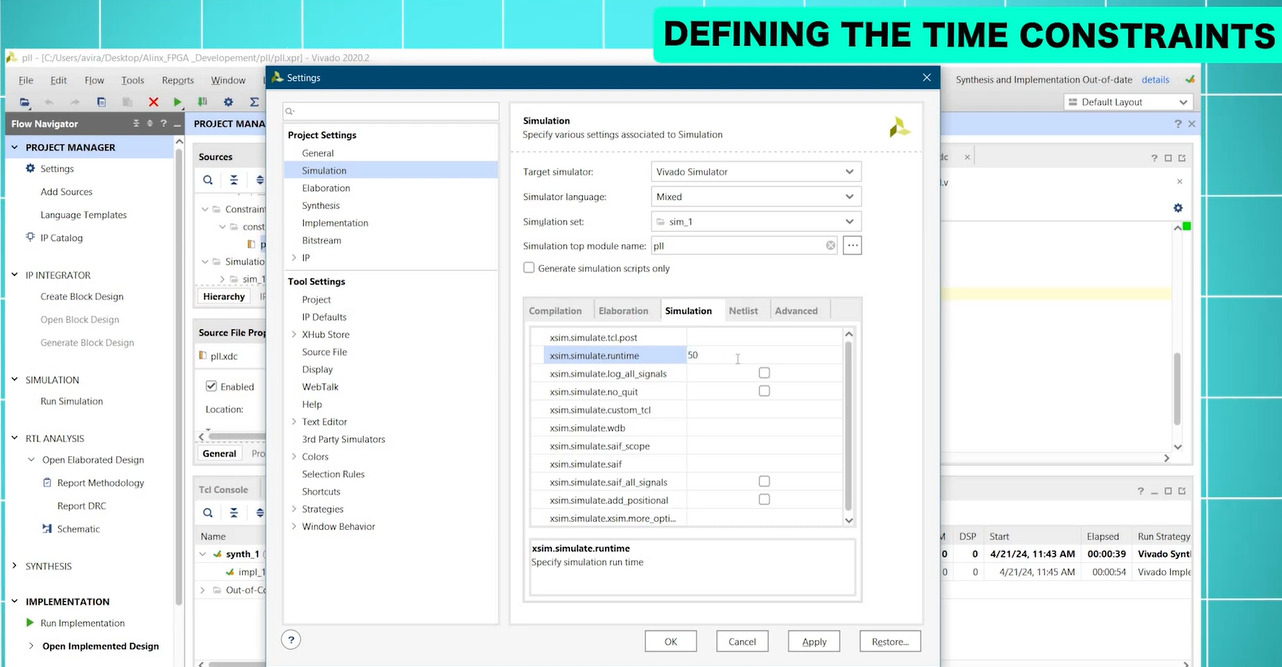 在烧录硬件之前,先通过仿真验证功能,步骤如下:打开 Simulation Settings,将仿真时间设置为 50 ms。