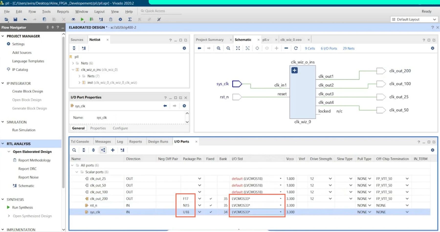 3. 设置电压标准:原本默认 1.8V,查阅开发板原理图后可知实际应使用 3.3V LVCMOS,所以改为 LVCMOS33。保存为 pll.xdc 文件