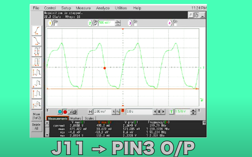 点击 Generate Bitstream,生成 Bitstream 文件,然后点击 Program Device,选择刚才生成的 Bitstream 文件,点击 Program,现在 FPGA 已经烧录完成,PLL IP 核也在 FPGA 上运行了。用示波器探测 J11 接口第 3 脚,就可观察到对应的 200 MHz 输出波形,和仿真结果一致,说明 PLL IP 正确配置,功能正常。