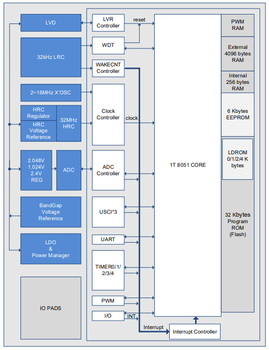 SC95F7573X28具有超高速1T8051 CPU内核,运行频率高达32MHz,在相同工作频率下,其执行速度约为其它1T 8051的2倍;IC内部集成硬件乘除法器、硬件CRC及双DPTR数据指针,用来加速数据运算及移动的速度。硬件乘除法器、硬件CRC不占用CPU周期,运算由硬件实现,速度比软件实现速度更快;双DPTR数据指针,可用来加速数据存储及移动。