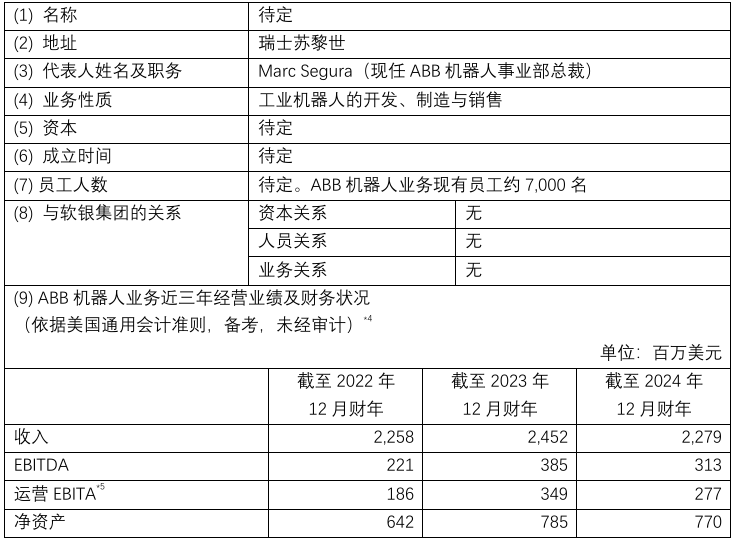 ABB 将剥离其机器人业务注入至一家新成立的控股公司。软银集团计划通过一家子公司,以53.75 亿美元的总价向ABB收购该控股公司的全部股份。收购完成后,该控股公司将成为软银集团的子公司。