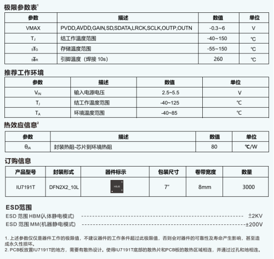 在 USB 音箱、便携式播放器、GPS 等设备的音频系统设计中,音频 IC 的性能直接影响设备的音质输出与运行稳定性,而选择一款兼具低噪声、高效率与灵活适配性的音频功率放大器,往往是解决设计痛点的关键 —— IU7191T 单声道 D 类音频功放,恰好能匹配这类需求。