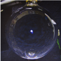 实验过程:100mL左右的球形烧瓶装满水,水是经过特殊处理的,就是把溶于水中的空气排除掉。烧瓶两侧用环胶粘上压电陶瓷。信号发生器产生激励信号,通过射频功率放大器放大从而驱动压电陶瓷,激发出超声波。调节信号频率使烧瓶产生共振,其中心成为超声驻波波腹。用针管注入一个气泡,气泡会在声压作用下静止在驻波波腹。小心调节声强,关上灯,黑暗中裸眼可以观察到蓝白色的光点,就像夜空中的星星。
