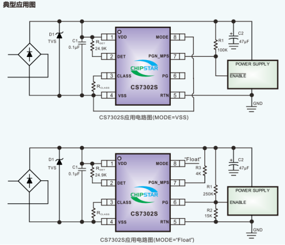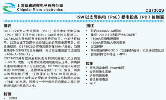 在网络语音电话(VoIP 电话)、安防摄像头系统、远程网络供电设备的设计中,一款符合标准、兼具稳定性与兼容性的 PoE PD 控制器,是保障以太网供电系统可靠运行的关键 —— CS7301S/CS7302S 15W PoE PD 控制器系列,恰好能匹配这类需求。该系列作为以太网供电系统中的受电设备(PD)接口方案,完全符合 IEEE802.3af 规范,单颗支持 15W 功率输出,可满足中小型网络设备的供电需求。