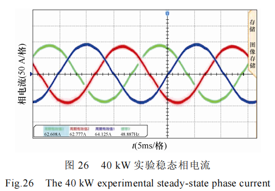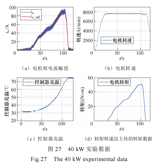 图 26 为 40 kW 实验时的稳态相电流波形。由波形可看到,三相交流电流幅值相等,均达到 88 A,平衡度比较好,控制器运行良好。图 27 为上位机与功率分析仪存储下来的一些数据波形,其中包括电机相电流幅值给定值与实际值波形、转速波形、控制器壳温以及电机输出转矩的波形。从数据波形可以看到,交流电流峰值达到了 88 A,转速达到了7 600 r/min,转矩达到了 50 N·m。工况持续运行3 min 以上时,内壁温度基本达到热平衡状态,内壁最终温度为 76℃,此时估算 MOSFET 管结温约