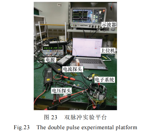 为了验证系统的均流特性以及在母线电压600 V 下的开关性能,对电子系统进行了双脉冲测试。测试条件为母线电压 600 V,最大负载电流120 A,驱动电阻 2 Ω,负载电感 45 μH。双脉冲实验平台如图 23 所示。电压探头采用了两个差分探头,型号为 TT-SI 8071,带宽为 200 MHz,测量并联 MOSFET 管的其中一个的 VGS 电压与 VDS 电压。电流探头采用两个罗氏线圈,带宽为 100 MHz,分别测量并联 MOSFET 管的两个漏极电流。尽管与同轴分流器相比,100 MHz 带宽的电流探头由于时间延迟,对于损耗计算可能不精确,但该探头可以揭示电流波形的细节。双脉冲测试整体波形如图 24所示,图中浅蓝色线为驱动 VGS 电压信号,红色线为 MOSFET 被测管 VDS 电压,深蓝色与黑色线分别