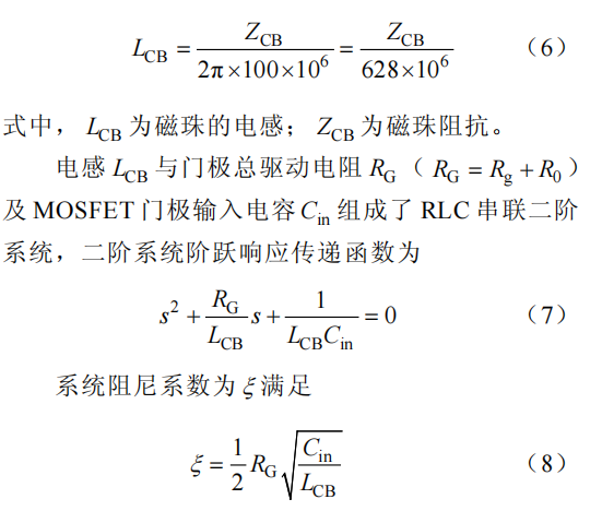 兼顾面积、功率、散热等因素,选择了采用磁性元件平衡回路阻抗特性的方法,保证并联等效阻抗相同。因此,在并联 SiC MOSFET 管的开通电阻与关断电阻的后面分别串联了一个铁氧体磁珠 Lg1与 Lg3,同时也可以抑制 SiC MOSFET 栅极回路中快速开关引起的振铃。磁珠特有的高频电阻和低频感抗特性,可以很好地捕捉和消除高频噪声,但其存在的微小电感量对脉冲前沿有一定的影响。阻抗值大的铁氧体磁珠对信号的高次谐波抑制作用好,但对脉冲信号的上升沿延迟却较大。为了实现脉冲上升沿延迟小并且高频抑制作用强,可按电感的暂态特性来计算选择所需磁珠的阻抗值,这里以MLCB2B3216 系列磁珠为例,给出磁珠阻抗选取的理论依据,实际取值可根据实验结果微调。