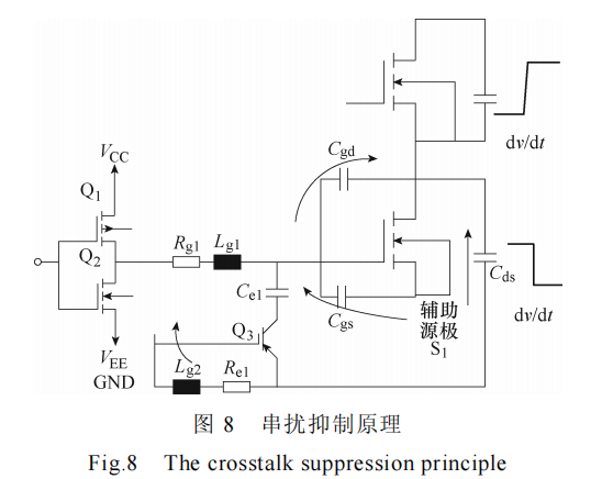 此外,在每个 SiC MOSFET 管的开尔文源极上均增加了一个源极电阻 Re 与一个铁氧体磁珠,该源极电阻 Re 的阻值取为 1 Ω,有利于消除相互并联的SiC MOSFET 管上源极杂感的不同而形成的环流,并可以形成良性负反馈,降低开关较快的 SiC MOSFET 管的开关速度,提高开关较慢的 SiC MOSFET 管的开关速度,使电路运行取得平衡。这里利用铁氧体磁珠的高频特性,与源极电阻串联,可消除存在于环路中的高频干扰和尖峰干扰,有利于减小并联 MOSFET 管源极杂感不同导致的电压差,进一步减小环流,同步门极信号。另外,在每个 SiC MOSFET 管的门极上增加了一个三极管 Qx和电容 Cex 的串联电路,配合开尔文源极电阻 Re 可减小对每个 SiC MOSFET 管关断时产生的负向串扰电压。串扰抑制原理如图 8 所示,当桥臂上管的 SiC MOSFET 管关断时,上管的 d /d v t 急剧上升,下管的 d /d v t 急剧下降,这导致 Cgd 开始放电,放电电流沿着图 8 中实线箭头方向,耦合电流会从开尔文源极 S1 流向开尔文源极电阻 Re1,这样能够使三极管Q3 开启,将串联的电容 Ce1 连接到门极 GS 上,为耦合电流提供一个低阻抗通路,有效地抑制了负向串扰,避免了 SiC MOSFET 管的门极由于负向串扰而承担过高的负向电压,导致的门极绝缘层损坏。