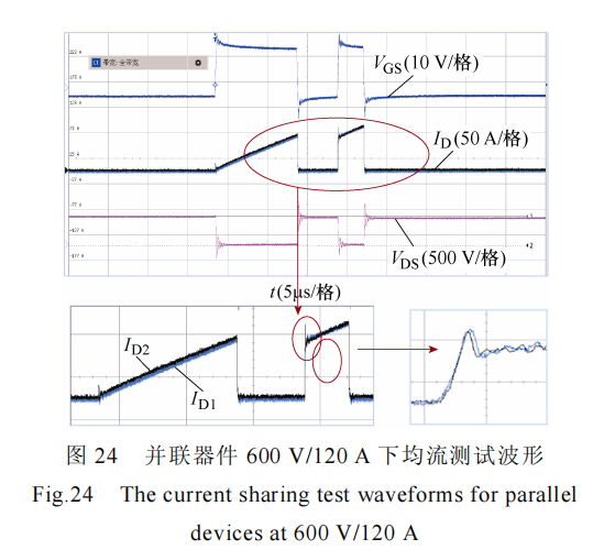为罗氏线圈测量两个并联管的 ID 电流。由测试波形可知,该并联系统在 600 V/120 A 的工况下可以可靠地开通与关断,满足高功率密度控制器的最大工况要求,并且从并联 MOSFET 管的电流波形可以看出系统的动静态均流效果良好。