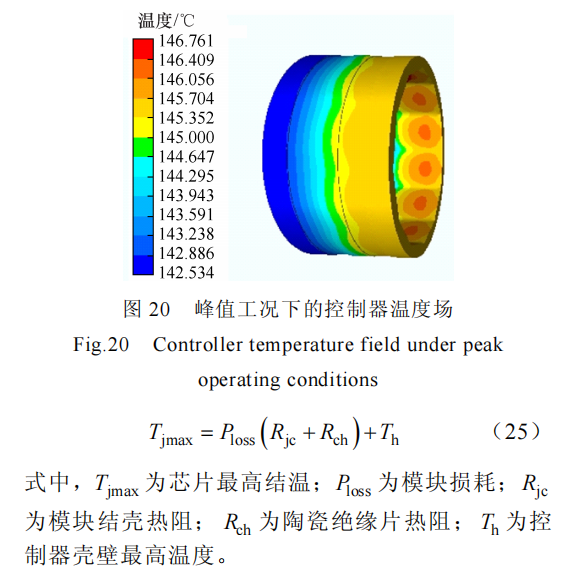 峰值工况下的控制器温度场如图 20 所示。从图20 的仿真结果可知,壳体内壁稳态最高温度为 147℃。考虑到器件结壳热阻和陶瓷绝缘垫片热阻,根据式