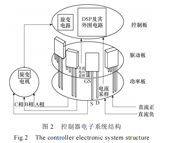 设计的控制器电子系统包括控制模块、驱动模块及功率模块三部分。为了实现最小的电流回路,并减小功率回路与驱动回路之间的相互干扰,主功率板和驱动电路板分别用两个PCB实现,SiC MOSFET的开尔文引脚在电流方面将功率回路与驱动回路分开,门极 G 与开尔文源极 S1 管脚焊接在驱动板上,功率源极 S2 与漏极 VD 管脚焊接在功率板上,除了有助于防止高压侧瞬变信号对栅极电压的反馈带来的干扰,降低动态损耗,还有利于实现并联 SiC MOSFET 管功率回路到驱动回路的对称布局。控制电路板、驱动电路板以及功率电路板均为圆形,并且是上下三层的结构,主控板的直径只有 72 mm,驱动板、功率板直径均为 88 mm,板子形状为圆形,有利于分立器件的对称布局,遵循最简单的物理对称原则,进一步有利于均流。在功率回路设计上,为了减小功率回路的耦合电容与杂散电感,并实现并联器件对称的功率回路,采用了多叠层的圆形PCB 结构来实现低感叠层母排。控制器电子系统结构如图 2 所示,设计的电子系统结构布局,不仅可以减小电机控制器的整体体积,进而增强控制器的集成度以及功率密度,还可以达到节省成本的目的。