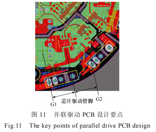 除了在电路上采取均流的措施外,驱动回路布局上也采用了物理上减小并联杂感的方法,最终的驱动板 PCB 布局如图 10 所示,12 个 MOSFET 管均匀地分布于圆形的驱动板上,两个并联的 MOSFET管在布局时均满足从每个管的栅极到驱动器(驱动芯片加推挽芯片)的输出以及从栅极返回到驱动器的路径严格做到对称,并且驱动器应放置位于两个并联 MOSFET 管的栅极引脚中心,如图 11 所示,而不是放在两个并联 MOSFET 的物理位置的中间。此外,门驱动器距离两个并联 MOSFET 管的距离越近越好,以减小门极驱动回路上的电感。