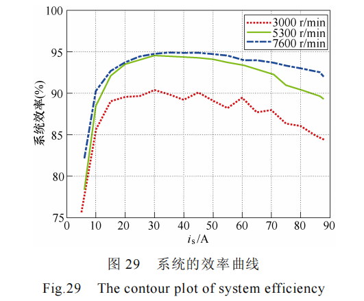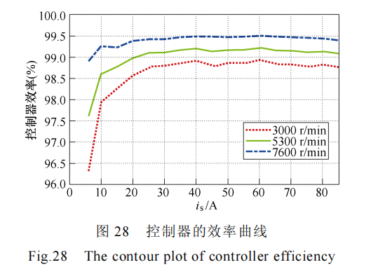 在风冷强制对流散热、母线电压 600 V 和开关频 率 10 kHz 条件下测量了控制器在不同转速(3 000~7 600 r/min)、不同峰值电流(0~88 A)下的效率曲线,其中最高转速 7 600 r/min 下控制器达到了峰值功率 40 kW。控制器的效率曲线如图 28所示,控制器最高效率达到 99.5%,这表明控制器在不同转速、不同功率下表现优异,能够高效率运行,也让整个控制器电机系统达到了 95%的高效率,效率数据曲线如图 29 所示。