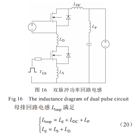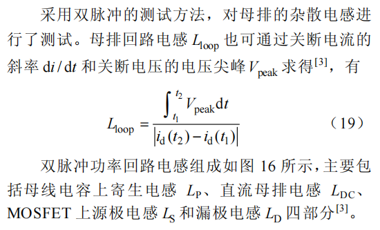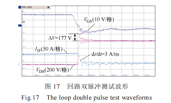 为了测量尽量准确,使用差分电压探头测量SiC MOSFET 的开通电压 VDS 以及门极电压 VGS,使用罗氏线圈测量漏极电流 ID 。图 17 为 600 V/120 A工况下双脉冲实验波形,图中ΔV 为关断电压尖峰Vpeak 的值,利用该过程计算母排电感。
