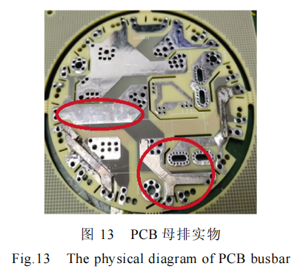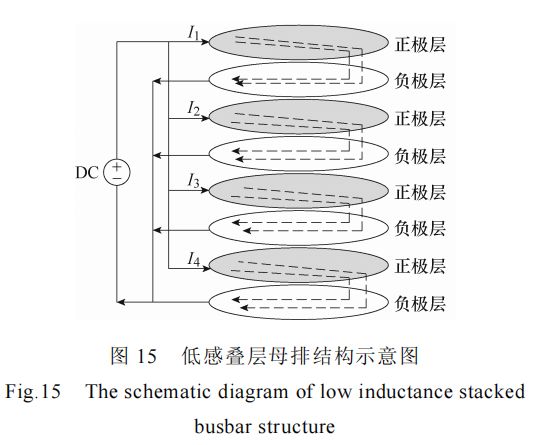 基于以上原理,利用垂直方向上方向相反的电流在最小的环路面积上有最小的寄生电感的原理,设计的 PCB 母排直径只有 8 cm,在板子厚度只有2 mm 的情况下,单层铜厚可做到 4 盎司、层数为 8的最大通流能力设计。低感叠层母排结构示意图如图 15 所示,板子共有 4 组 PCB 叠层,每组 PCB 叠层均由正母线层与负母线层组成,每组 PCB 叠层形成一个回路,且正母线层和负母线层中流过的电流大小相等、方向相反。四回路的 PCB 叠层,又可以进一步降低母排回路的杂散电感,避免功率开关器件在高速开关的过程中承受较大的电压过冲,从而降低功率损耗,提升系统效率。