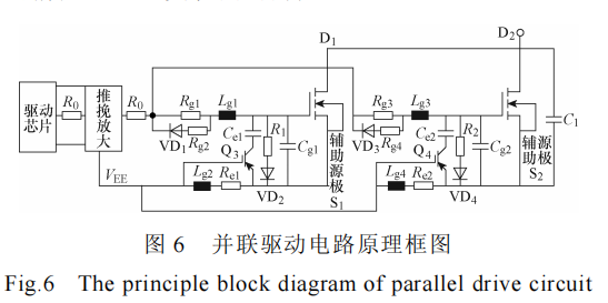并联驱动电路原理框图如图 6 所示。为了实现并联均流,两并联的 SiC MOSFET 管共用一个驱动芯片和推挽放大电路,除了共用一个门极驱动电阻R0 以外,每个 SiC MOSFET 管还有各自独立的开通电阻 Rg1(Rg3)与关断电阻 Rg2(Rg4),使每个 SiC MOSFET 管的门极电压可以独立地开通与关断,保证了在每个 SiC MOSFET 管的门极阈值电压有差异的情况下也可实现同时开关。
