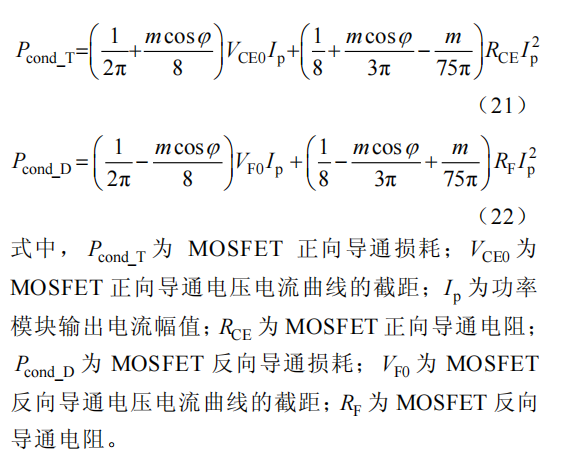 控制器采用 TO247 封装的 SiC MOSFET 分立器件作为功率器件。MOSFET 正向导通时,其并联的二极管处于关断状态,与 IGBT 模块相同。特别地,当二极管导通时,MOSFET 也会反向导通,但由于它的导通电阻远小于二极管的导通电阻,故二者并联的总电流基本流入 MOSFET,流经二极管的电流很小。计算时增加了 MOSFET 反向导通损耗。MOSFET 管正、反向导通损耗公式分别为