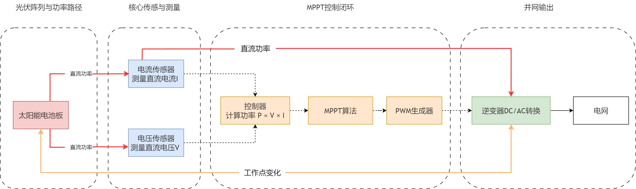 光伏逆变器是光伏发电系统的核心设备,负责将光伏组件产生的直流电转换为交流电,并实现并网或离网供电。光伏逆变器中的MPPT(Maximum Power Point Tracking)技术是提升光伏系统发电的核心机制,通过动态调整光伏组件的工作电压和电流,使其始终运行在IV曲线的最大功率点。MPPT算法的核心是实时计算光伏组件的输出功率(P= V×I),并通过不断微调工作点来寻找最大功率点,让光伏板始终工作在最大功率输出点上。所以光伏逆变器就两大核心任务:直流转交流和最大化发电量。