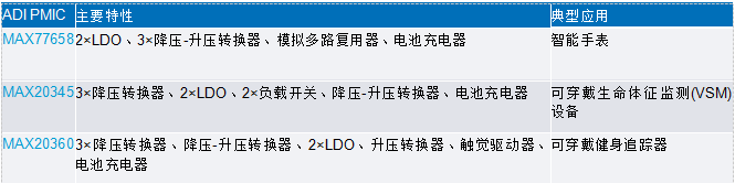 无论是开发智能手表、健康监测设备还是健身追踪器,这些PMIC解决方案都能在集成度、效率与性能之间找到黄金平衡点。ADI的PMIC设计始终围绕三大核心目标:尽可能缩减电路板空间、显著延长电池续航、大幅简化系统设计,而这些正是所有可穿戴产品成功的关键所在。参见表1。