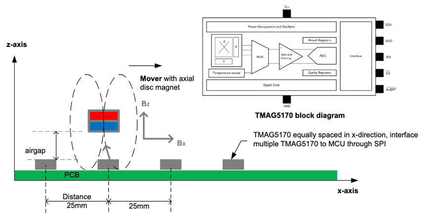 具有四通道 3D 霍尔效应传感器的低延迟精确线性位置检测参考设计采用以 25mm 间隔放置的 TMAG5170,以实现精确的低延迟线性位置检测。C2000™ MCU 以 ≥ 8kHz 的采样率从全部四个 TMAG5170 传感器读取磁场 Z 和 X 的数据,并计算移动磁体的位置,误差小于 0.15mm、延迟低于 57.5µs。