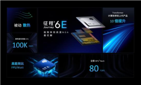 作为高速辅助驾驶计算方案最优解,征程6E基于第三代BPU纳什架构实现80TOPS算力,内置高性能车规级CPU可提供100K DMIPS算力。同时集成全功能MCU,以超高集成度实现更低的功耗和更优的系统成本,Transformer计算效率较上代产品实现10倍提升,可适配4D毫米波雷达与800万像素传感器融合方案,具备强大兼容性与量产成熟度,可支持从高端型到经济型的不同市场区间车型实现安心舒适的高速辅助驾驶功能,并且支持被动散热实现油电同智。