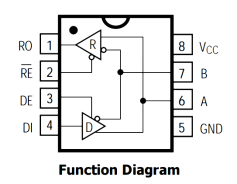 当DE为高电平、RE为高电平时,器件进入发送模式,将DI引脚的单端数据转换为A、B总线的差分信号进行输出;