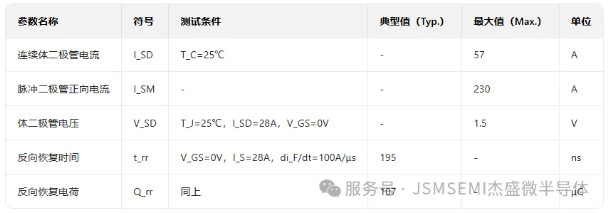 在感性负载场景(如 UPS 逆变环节),MOSFET 关断时易产生高 dv/dt(电压变化率),可能引发寄生振荡或器件误导通。JSM57N10C 通过优化芯片结构,显著改善了 dv/dt 耐受能力,即使在 di/dt=100A/μs 的严苛条件下,反向恢复时间(t_rr)仍能稳定在 195ns,反向恢复电荷(Q_rr)仅 107μC(),有效抑制了开关过程中的电压尖峰,降低了系统 EMC(电磁兼容性)设计难度。
