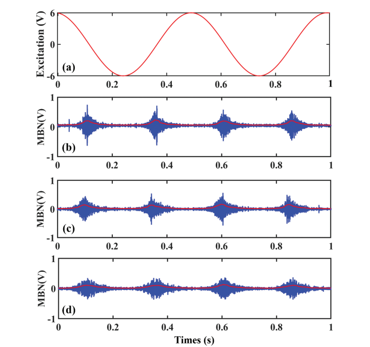 利用信号发生器、ATA-309C功率放大器、MBN传感器和NI采集卡搭建了测试平台。利用信号发生器提供频率为2hz、电压为6v的正弦波,由低频功率放大器AigtekATA-309放大,使样品磁化。