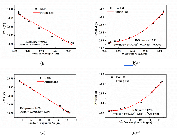 在磨损过程中,RMS随磨损率m、表面粗糙度Sa和平均深度Sz等摩擦学指标的增加而线性减小。然而,均方根与残余压应力σ之间的关系呈现出复杂的非线性关系。随着摩擦学指标和应力的增加,FWHM均呈二次增长。
