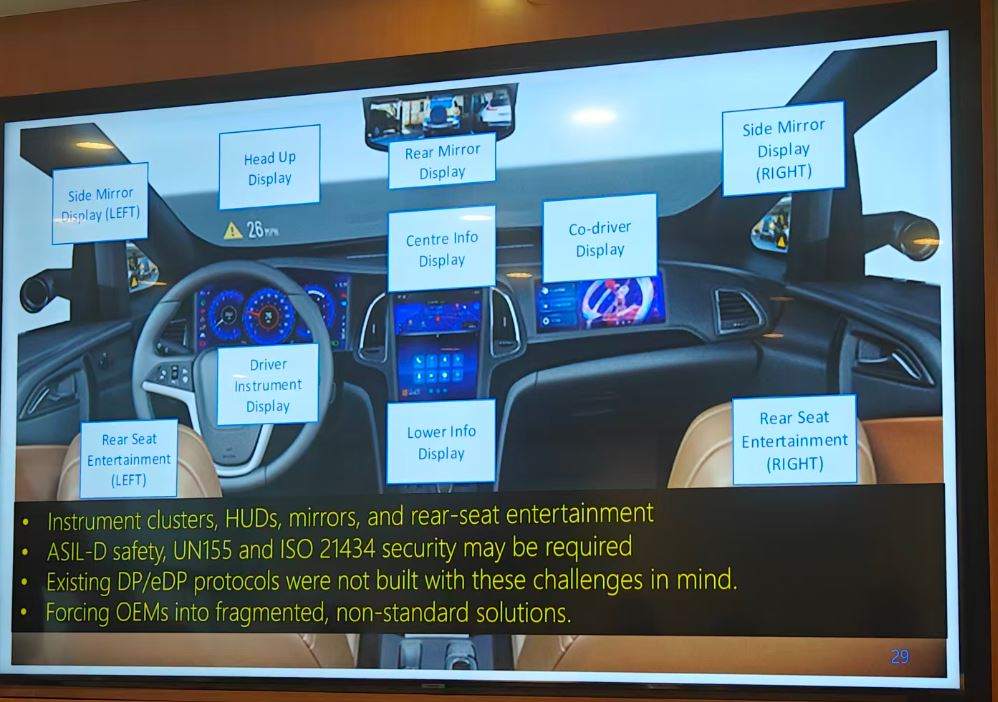 作为本次发布会的核心议题之一,VESA重点介绍了其于2025年5月发布的DP AE合规测试规范模型。这一完全可执行的Linux C模型包含500多项功能安全与信息安全合规测试,使芯片制造商能够基于VESA DP AE标准,构建和测试用于汽车显示器的视频源(电子控制单元/ECU)、桥接器件(如串行器/解串器)和接收设备(如时序控制器)。