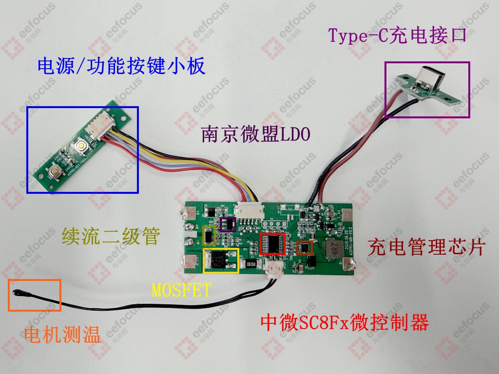 The core microcontroller is an 8-bit MCU from CMSemicon (Zhongwei Semiconductor), from the SC8Fx series. It handles functions like processing data from the motor temperature sensor, controlling the power/function button board, and controlling the motor driver. An LDO from MicrOne (Nanjing Micro-Mege Electronics) supplies power to the MCU.