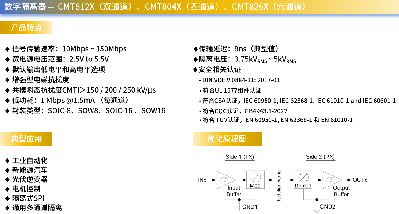 此外,CMT812X(2通道)、CMT804X(4通道)与CMT826X(6通道)系列标准容耦隔离器还采用了先进的电路技术,能够以较低的功耗实现高电磁抗扰度,并最大限度地减少由于高频载波和I/O缓冲器切换引起的辐射。