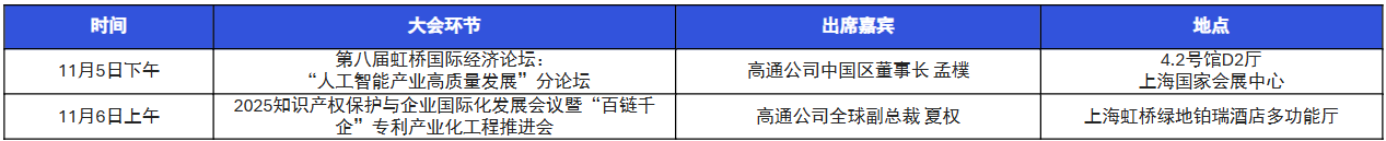 高通公司中国区董事长孟樸、高通公司全球副总裁夏权将分别参加进博会同期举办的第八届虹桥国际经济论坛及相关配套活动,分享高通公司在AI、6G等前沿技术领域的实践与思考,以及在智能产业生态合作与发展方面的实践与成果。