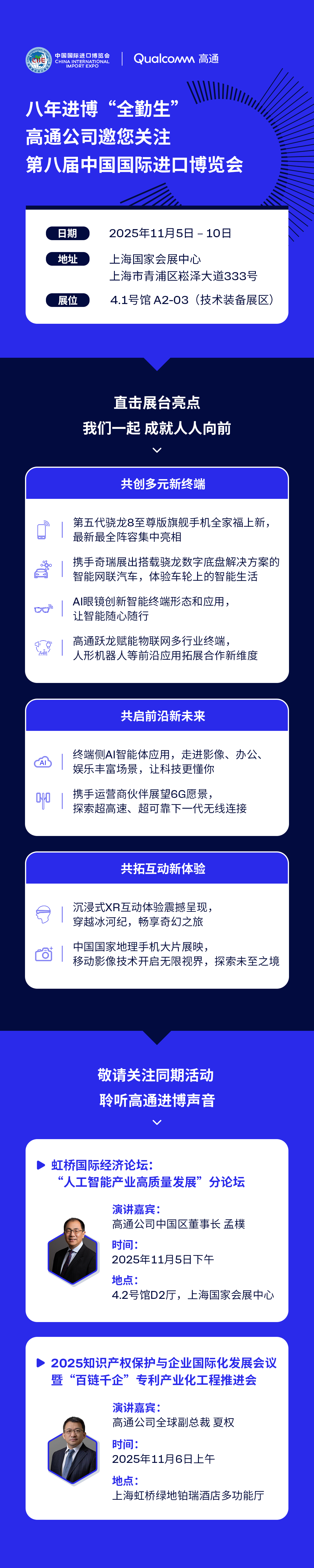 我们诚挚地邀请您莅临高通公司展位,体验高通与产业伙伴的最新合作成果,也期待您关注进博会期间高通公司的参会动态,共同见证开放合作与技术创新引领的智能未来新篇章。