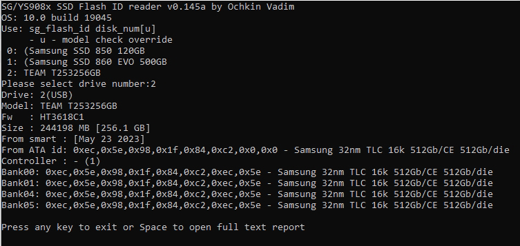 主控是Yeestor YS9085N,用量产部落网提供的Yeestor(SiliconGo) flash id软件,检测出闪存颗粒是Samsung 32nm TLC: