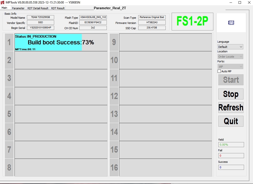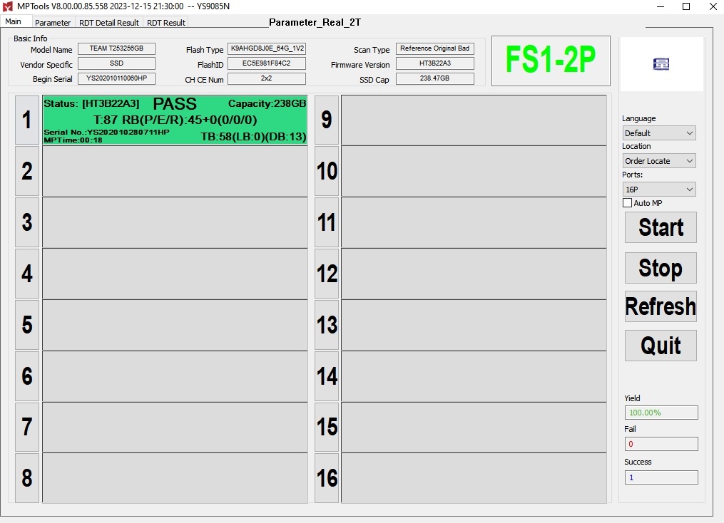 返回到Main标签页,点击右侧Start开始量产。顺利的话,整个量产过程不到1分钟就结束了,软件显示PASS。