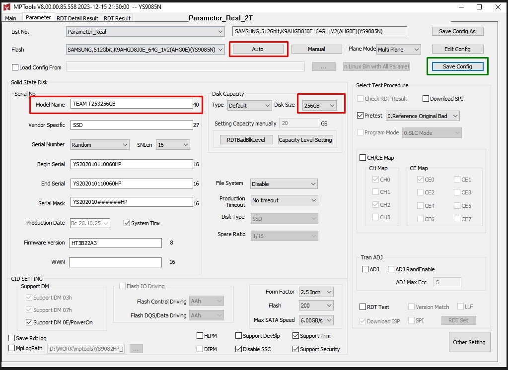 接下来从量产部落网下载YS9085N量产工具,用WinRAR解压后打开主程序,进入Parameter – Edit Config(没有设定密码,直接点击“确定”),点击Auto,量产工具会自动检测并匹配闪存颗粒。设置磁盘名称和序列号,磁盘容量大小可以使用自动,其他设置项保持默认,然后点击Save Config保存配置。