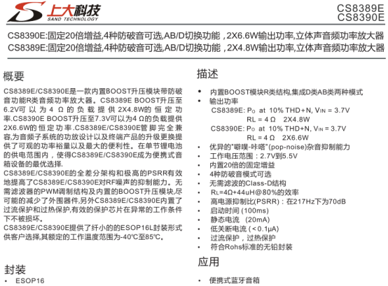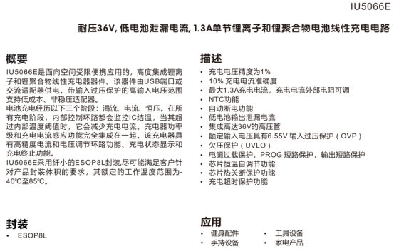 CS8389E/CS8390E 作为内置 BOOST 升压的双声道 D 类功放,以 ESOP16L 纤小封装适配紧凑设计,通过独创 AERC 技术强效抑制 EMI 干扰(符合 FCC 标准且有充足裕量),支持 AB 类 / D 类升压模式切换,可提供最高 2×6.6W(CS8390E)的双声道输出功率,搭配多模式防破音与过流、过热保护,确保音频输出清晰稳定且耐受复杂工况。而 IU5066E 以 ESOP8L 封装进一步压缩空间,凭借 “涓流 - 恒流 - 恒压” 三阶段精准充电、36V 耐压防护、低电池泄漏电流(0.5μA 典型值)及多重安全保护(过压、过温、超时充电保护等),为设备提供安全高效的供电保障,其自动断电功能还能避免电池倒灌,延长续航与电池寿命。