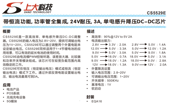 在电池产品、POS系统、无线充电设备、5G模块及1~4节锂电池供电设备等场景的供电设计中,常面临宽电压适配难、恒压恒流双需求、大电流输出稳定性不足及散热压力等问题,CS5529E可针对性应对这些需求。该器件是一款功率管全集成的单电感升降压DC-DC芯片,采用EQA16封装,输入耐压24V,工作电压范围2.8~20V,输出电压可调1~20V,最大输出电流达3A,能灵活适配升压、降压多种电压转换场景,有效延长电池使用时间。
