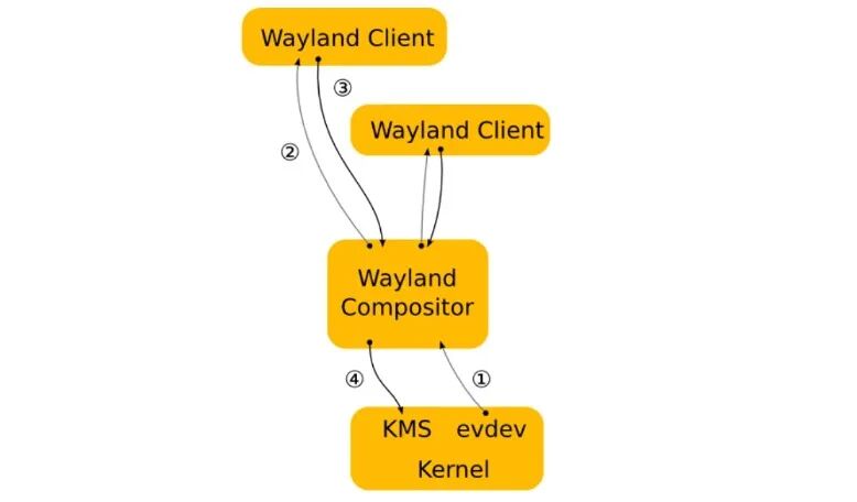 Wayland与Xserver同为显示框架,但为了更好的适配高性能的GPU,允许Client端直接渲染,无需通过Server渲染再传到Client,简易的架构如图所示: