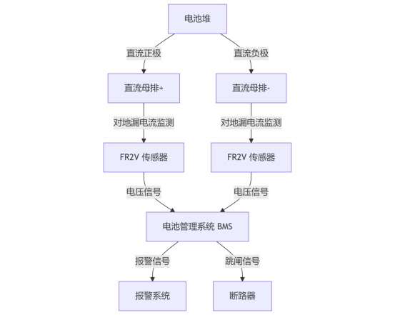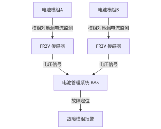 电池模组间绝缘监测: 在多模组堆叠的储能柜中,FR2V可检测模组间或模组对地的漏电流,定位故障模组。其工作温度为-10°C~70°C,存储温度为-40°C~85°C,适应户外储能柜环境,但也避免传感器长时间暴露在>100°C环境(如靠近功率器件),以保证寿命。另外其仅有20mA电流消耗,不增加系统负担。其应用框架图如下: