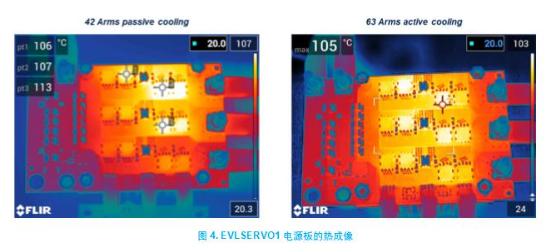 在常规组装状态下,MOSFET器件不可见。为检测其实际温度,我们采用定制线缆将功率板与控制板重新布置为共面并列结构。通过热像仪拍摄功率板温度分布:初始测试关闭风扇,电机以42A(有效值)正弦电流运行,在25℃环境温度下约15分钟达到热平衡状态。板面最高温度点出现在低侧MOSFET,达到113℃(图4左)。随后开启风扇并将输出电流提升至63A(有效值),相同最热MOSFET的最高温度降至105℃(图4右),这得益于强制气流使板卡至环境的热阻显著降低。需说明的是,当两块电路板堆叠安装时,预计最高温度将高于本次测试值,但STL160N10F8器件允许的结温高达175℃,仍能确保驱动器在全功率运行时的设计裕量与安全可靠性。