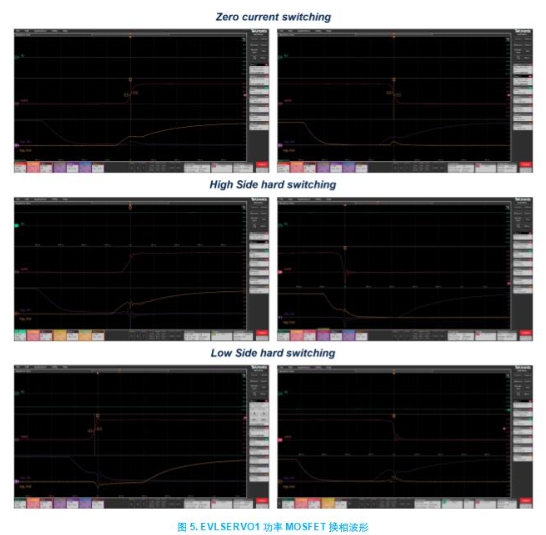 空载时开关特性非常洁净,MOSFET电压与输出电压的上升/下降沿压摆率均约为0.83V/ns。但当输出电流达到90A峰值时,测量电压出现扰动,这归因于功率级路径中的寄生电感。得益于STSPIN32G4及功率MOSFET的鲁棒性,这些扰动仍在安全范围内:低侧硬开关关断控制的上升沿最大过冲约5.3V;高侧硬开关关断控制的下降沿测得对地负向电压约-27V(该脉冲经板对板连接器滤波后至控制板端衰减至-10V)。