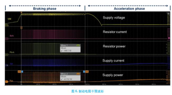 制动电阻的干预实例如图6所示,本次测试中通过禁用机械制动器(仅保留摩擦损耗)并利用系统旋转惯量储存动能,使电机先沿顺时针方向运行后突然接收逆时针转向指令以激发再生制动。如图6可见,初始阶段因电机作发电机运行并向系统bulk电容注入电流,导致总线电压持续上升;由于测试采用无法回馈能量的单象限电源且未连接其他能耗设备,当电压超过预设阈值时,保护电路立即启动,通过制动电阻以脉冲模式多次激活的方式将总线电压精确钳位在62-65V安全区间。测试数据显示脉冲电流峰值达60A,产生约3.4kW的瞬时功率和148W的平均功耗,而EVLSERVO1在此期间仅需从电源获取4.7W平均功率用于维持内部电容充电。完成制动后,电机成功逆转方向并进入加速状态,电源输出功率逐步提升至400W以驱动系统达到目标转速。