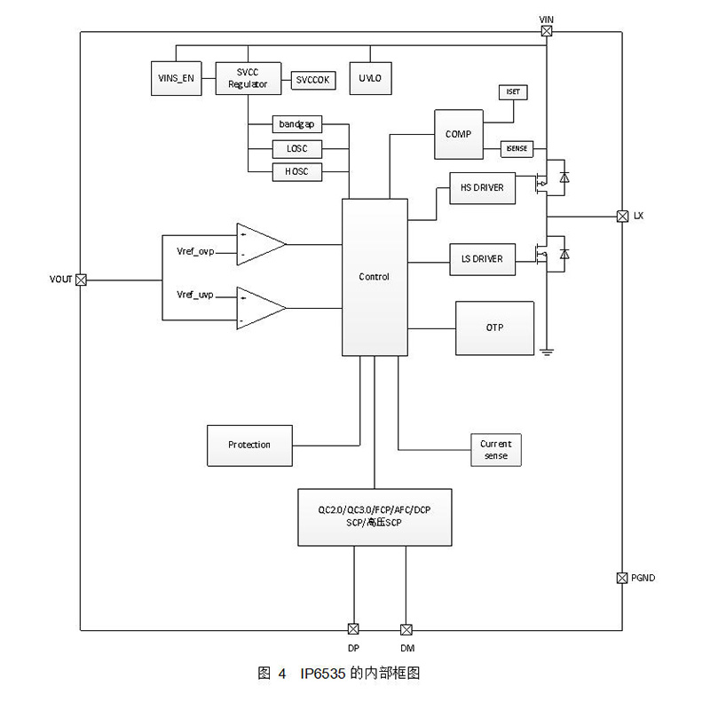 IP6535集成了多种快充输出协议,包括DCP、QC2.0/QC3.0、AFC、FCP及SCP等。通过DP/DM引脚,IP6535可自动识别接入设备的快充协议,并相应调节输出电压和电流,有助于实现较快的充电速度并兼顾安全性。常见的输出电压电流组合包括5V/3A、9V/3A和12V/3A,可匹配多数设备的充电需求。