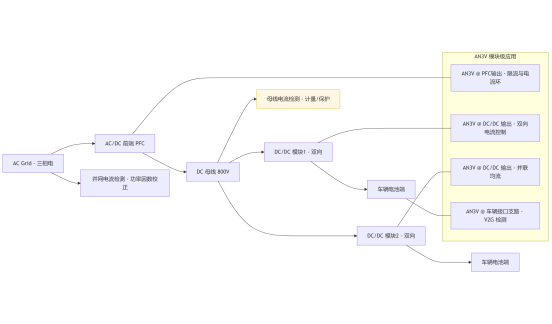 V2G(Vehicle-to-Grid)双向充放电系统相比传统快充系统,电流检测要求更高。它既要完成车端充电(G2V),又要在并网放电(V2G)时精确控制能量流向。