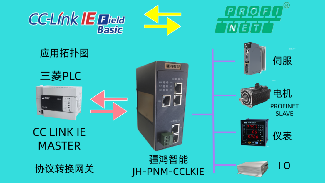 疆鸿智能JH-PNM-CCLKIE主要实现了CC-Link IE FB从站和Profinet主站(简称PNM)。PNM-CCLKIE作为从站接入到CC-Link IE FB网络中。