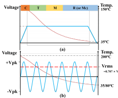 电场冷却直流极化FC-DCP以及电场冷却交流极化FC-ACP电压随温度变化的示意图在图2(a)和(b)中分别表示。不同晶体根据其相变温度Tpc和居里温度Tc调节不同的极化降温区域,通过不同场冷条件下进行极化。为了比较交流极化ACP和直流极化DCP的极化电压,使用了每厘米均方根电压(Vrms/cm)来作为交流极化ACP电压的单位。“rms”也称为交流电的有效值或热值,等效于在电阻器中产生相同热能的直流电DC电压值。因此,我们使用了kVrms/cm作为所有实验中交流极化ACP的电压单位,来准确直流极化DCP比较所有的性能。正弦波交流电AC的均方根电压Vrms是由交流电AC峰值电压(Vpk)的乘以71%计算而得。