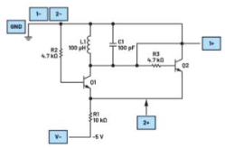构建图1和图2所示Peltz振荡器的仿真原理图。计算偏置电阻R1的值,使得晶体管Q1和Q2中的集电极电流均大于200 µA。假设电路采用-5 V电源供电。计算C1和L1的值,使得谐振频率至少为1 MHz。执行瞬态仿真。LC谐振电路的峰峰值输出摆幅应限制在±1个二极管正向压降(~±0.6 V)以内。计算并模拟R2 = R3时的阻值,使得输出摆幅提高到至少±1.25 V。保存这些结果以与实际电路的测量结果进行比较,并记录在实验报告中。
