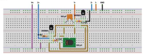 在无焊试验板上构建图3所示的Peltz振荡器电路。方块表示连接ADALM2000模块示波器通道和电源的位置。务必反复检查接线之后,再打开电源。